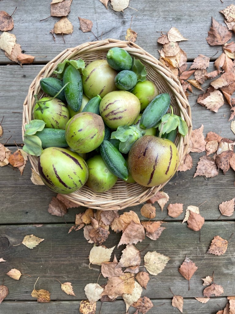 Pepinon hedelmät kasvoivat isoiksi, pienen melonin näköisiksi, soikean pyöreiksi nopeaan, mutta pysyivät kivikovina pitkään. Suurimmat keräsivät kokoa oman nyrkkini kokoisiksi, osa jäi paljon pienemmiksi. Ensin hedelmä on haalean keltainen, kypsyessään väri tummenee ja syvenee kauniisti. Hedelmään ilmestyy myös söpöt violetit raidat, ihan kuin joku olisi maalannut ne sille vesiväripensselillä.
