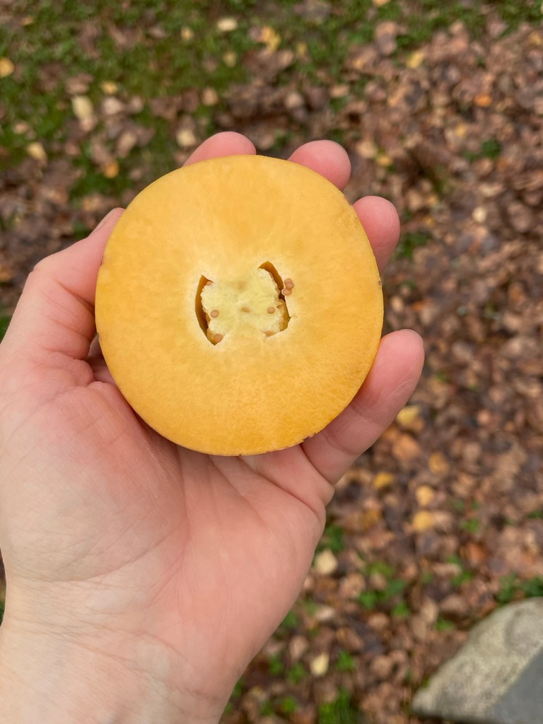 Loput hedelmät keräsin pakkasilta suojaan sisälle kypsymään ja kivasti ne kypsyivätkin. Hedelmien säilyvyys oli tosi pitkä! Viimeisen maistelin joulukuussa – maku ei ollut parantunut. Silti kasvtuksesta jäi hyvä fiilis ja voisin kasvattaa uudestaankin, sillä kasvi oli niin kaunis katseltava!