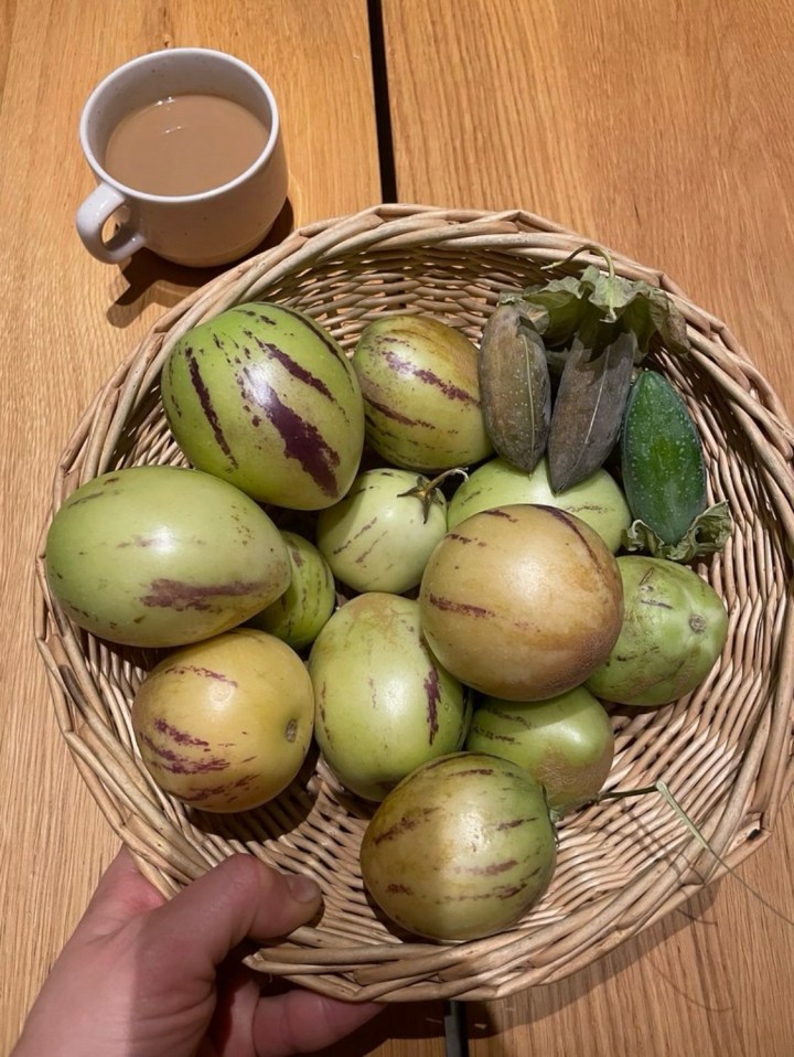 Eli mikä on pepino – suomalaisittain päärynämeloni? Pepino tarkoittaa espanjaksi kurkkua, mutta hedelmä ei muistuta ulkonäöltään, eikä maultaan kurkkua. Tieteellisen nimen kasvisukulaisuuden (Solanum) mukaan pepino on samaa sukua tomaatille (Solanum lycopersicum) ja perunalle (Solanum tuberosum). Okei, ei maistu kummallekaan noistakaa! Eli kyllä lähemmäs menee tämä suomalainen nimitys: päärynämeloni, niin hedelmän ulkonäkonäön, kuin makunsa puolesta.